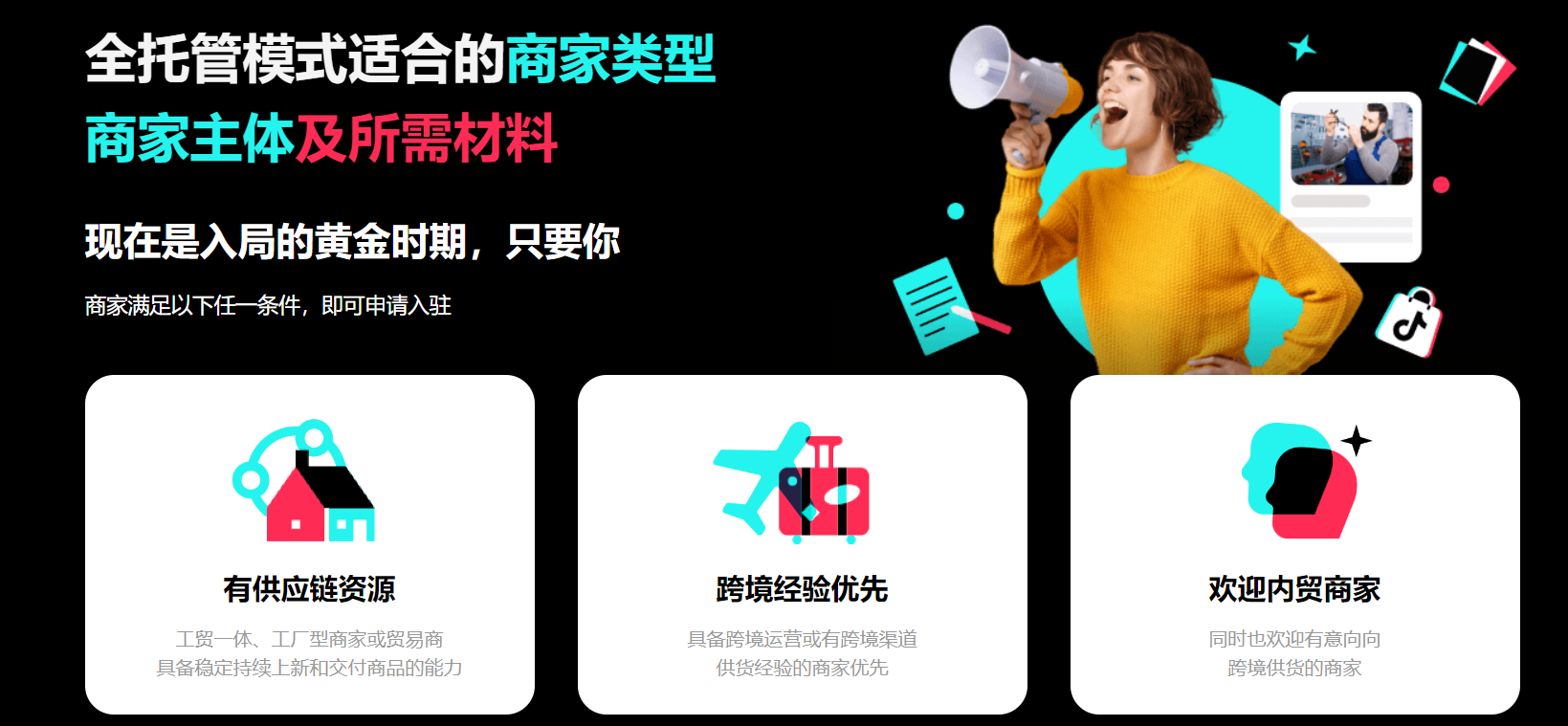此外,TikTok全托管店铺是TikTok电商为卖家提供的一种店铺类型,让卖家可以将自己的店铺完全交给TikTok电商管理。卖家只需负责商品运营和发货,而平台的角色包括物流、质检、销售、推广引流、定价上架、售后服务等23。这种模式让卖家可以专注于供货,而其他所有运营工作都由平台完成。